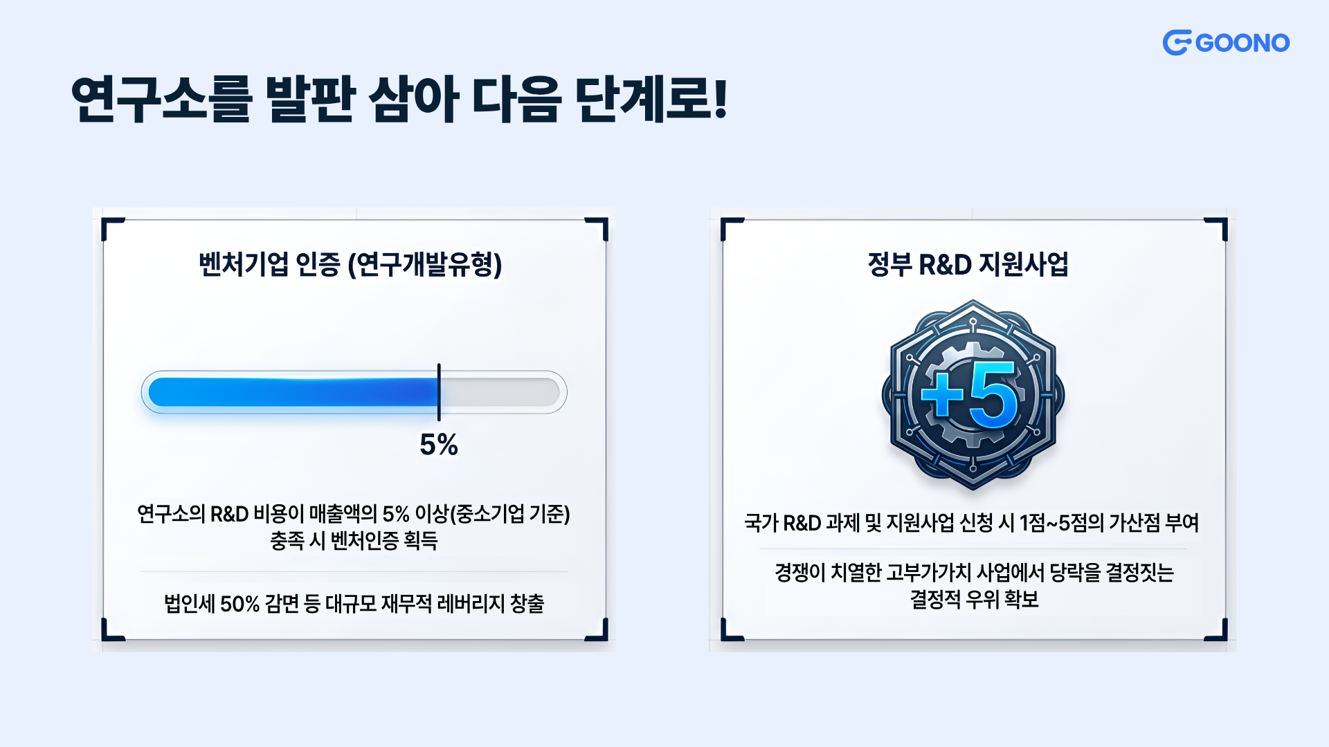 - 벤처기업 인증 연계: '연구개발유형'으로 벤처인증을 받을 때 연구소는 필수입니다. 연구소의 R&D 비용이 매출액의 일정 비율(중소기업 기준 5퍼센트 등)을 넘으면 벤처인증을 통해 법인세 50퍼센트 감면 등 더 큰 혜택을 노릴 수 있습니다.
