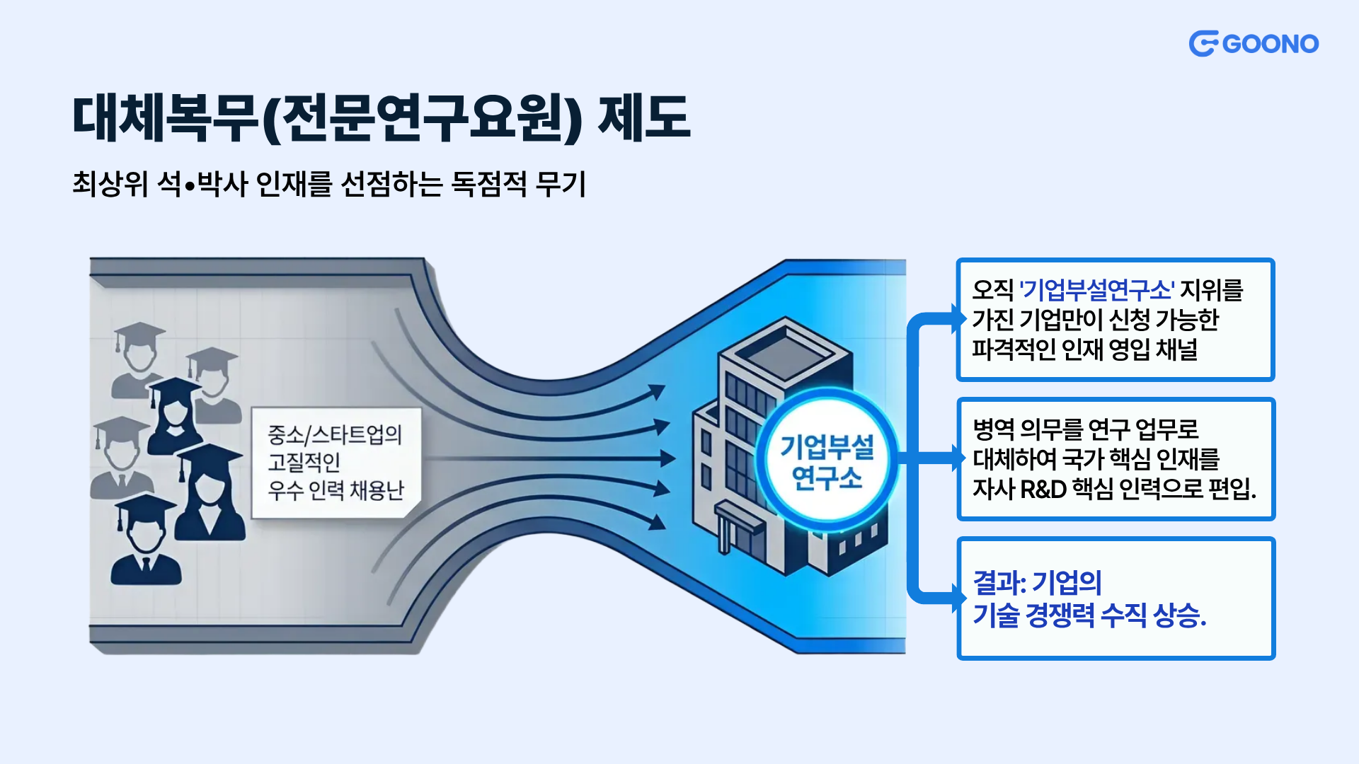 - 전문연구요원(병역특례) 제도: 우수한 석박사 인력을 채용하고 싶다면 연구소가 정답입니다. 병역 의무를 연구 업무로 대체하는 전문연구요원은 오직 '기업부설연구소' 지위를 가진 곳만 신청할 수 있는 파격적인 인재 영입 수단입니다.